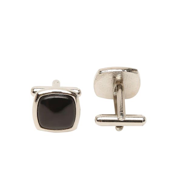 A pair of black stone inlaid tonal plain square-shaped cufflinks, has a hinged-back closure